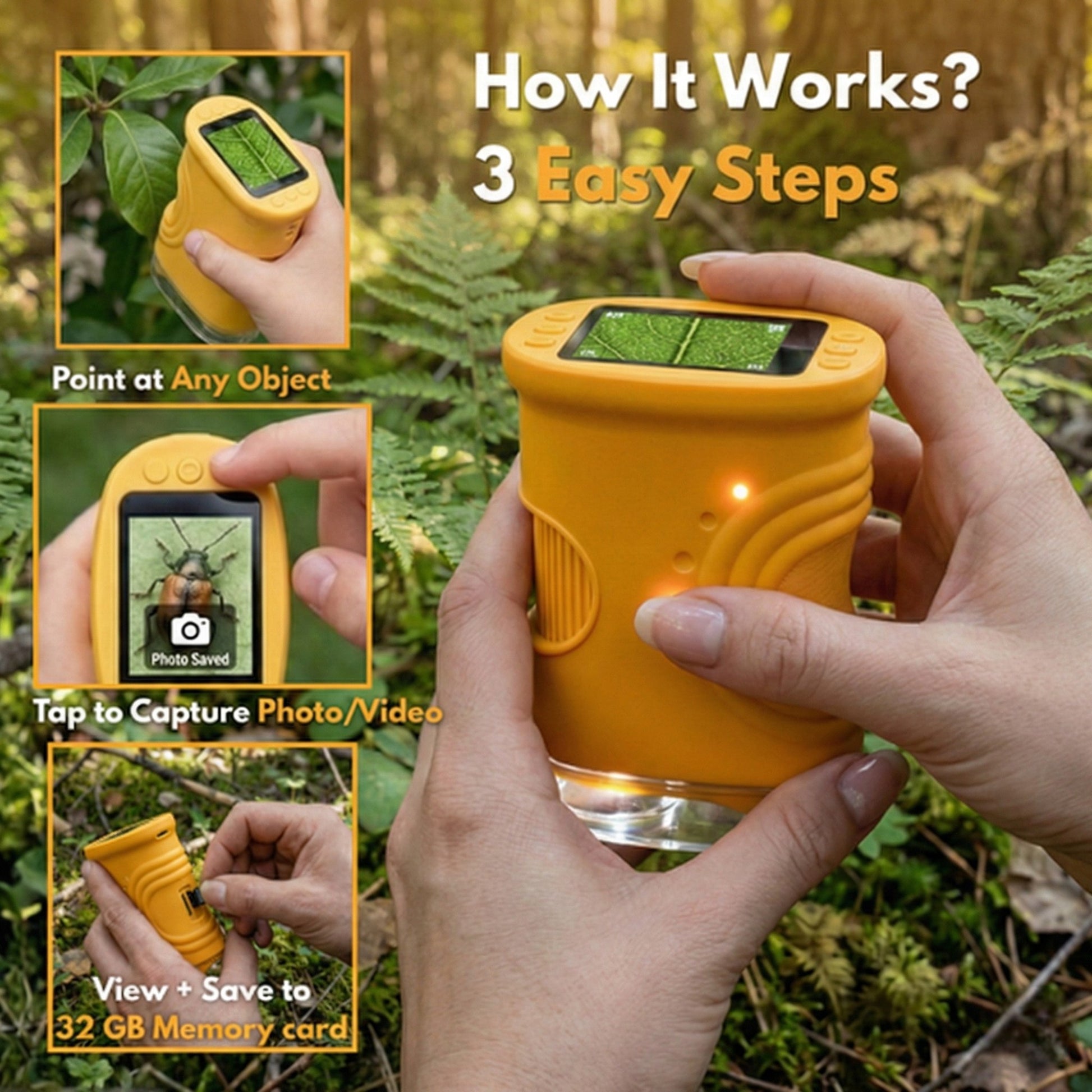 The microscope captures both photos and videos, so kids can save discoveries and replay them anytime. It even comes with a 32GB memory card, ready to use right out of the box.